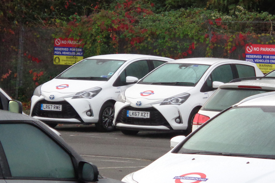 Details: Toyota has been the main supplier of cars to the central fleet over the past year or so, with over 20 of the Prius model being taken. There have also been a few of the smaller Yaris, including this pair seen in the car park at Acton Works on 28th October 2017. Although both were new that month, their fleetnumbers are 101 apart. In the foreground is Ford Focus estate 7683F, disposed of to British Car Auctions a few days later. |