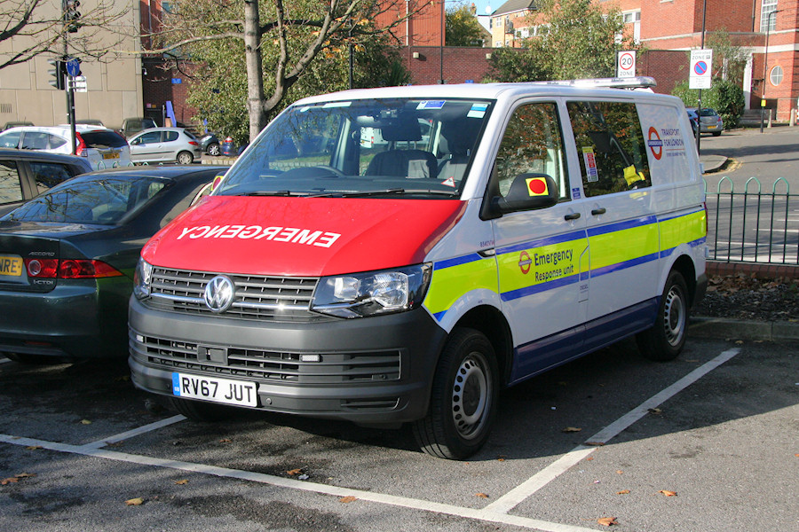 Details: A new van for the Emergency Response Unit was delivered in October 2017, this being a short-wheelbase Volkswagen Transporter crew van. It replaced smaller Renault Kangoo Maxi 7727R and carries the same livery of white/blue with a blue/yellow/blue stripe and red bonnet. Derek found it parked at Morrisons in Acton on 5th November 2017. A couple of observations. There is what appears to be a camera in the windscreen, alongside the rear-view mirror. The blue notice nearby does state that CCTV recording is in operation and has also been seen on various recent deliveries (including the London Buses Toyota Yaris cars) although I was not sure what, where or when they would be recording. The second point is the rectangular aperture just above the number plate. This is not a VW item (compare with similar 8199VW) and I have noticed a similar object on several new National Express coaches. I presume it is either a camera or a sensor of some sort but please send your answers on a postcard to the usual address! |