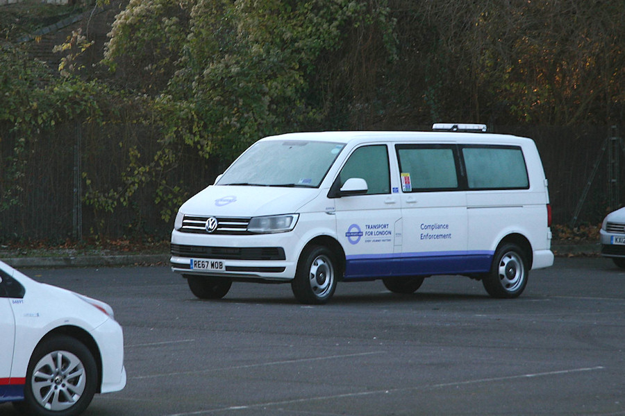 Details: A rather empty car park at Acton Works on 9th December 2017 allowed Derek to capture this view of newly delivered Volkswagen Transporter minibus 8599VW. It carries the white/blue/lilac livery of TfL Private Hire, and is lettered for Compliance Enforcement. This suggests it will be a replacement for Ford/Ashwood Transit 6987F, latterly kept at Mandela Way. Note that this new minibus appears to be to a slightly different specification to others delivered to the central fleet recently (such as 8258VW), featuring body coloured bumper and mirrors (instead of black) and three chrome strips across the grille (instead of just one). Perhaps unsurprisingly, a couple of LUL Toyota Prius cars were also present, including 8489T peeking in on the left. |