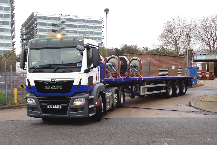 Details: The two MAN tractor units delivered in September are now in service in full LUL livery and with dayglo wheelnut covers. The red band has been added between the blue skirt and the silver 'safety' stripe, but does not extend around the front. However, the main reason for including this photo is the trailer. Ray reported that this carried the number T78, thus confirming that this is the number allocated to one of the two new Dennison flatbed trailers. This is clearly the one with the lower headboard (see this photo for a comparison), which means that the only unknown now is whether this one is extendable or not. Oh, and it would be good to have confirmation that the other one (the extendable one with the taller headboard) is in fact T77! Seen leaving Acton Works on 4th December 2017. It would be interesting to know what the low-loader visible in the background was going to collect. It does not look like the type used to carry tube carriages. |