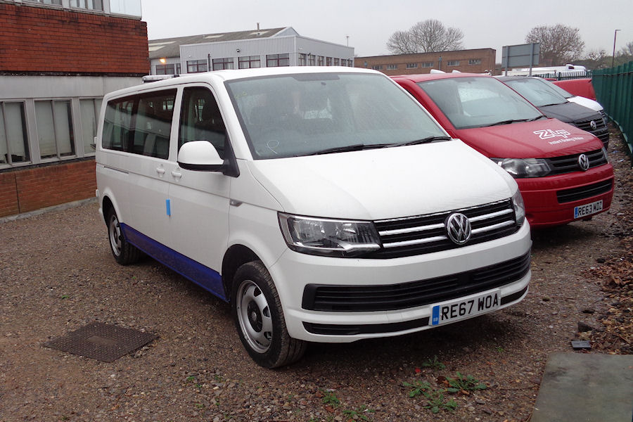 Details: Three more Volkswagen Transporter Minibuses were found at the Cordwallis dealership in Bedfont on 11th January 2018. Two featured light-bars and white fittings (bumpers, mirror housings and door handles), similar to 8599VW, suggesting they may also be destined for TfL Private Hire. RE67WOA is seen here, while similar RE67WOD is just visible between the black and red vans in the background. |