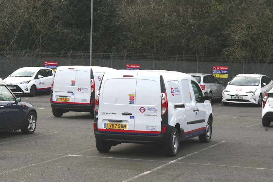 Details: Another Acton Works car park view, this time on 13th January 2018 and dominated by newly delivered vehicles. To the fore are Renault Kangoo Maxi vans 8495R and 8497R, both of which were soon in use from Edgware Road Station. At the left-hand end of the back row is Toyota Yaris hybrid car 8621T while on the right are Toyota Priuses 8572T (new last September) and one un-identified. |