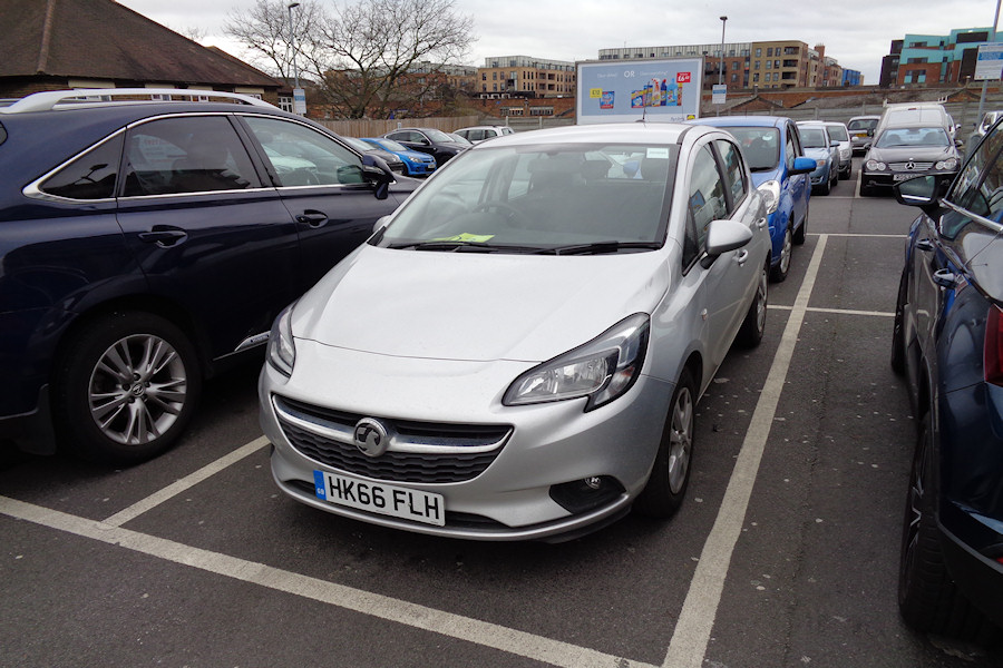 Details: Another anonymous silver Arriva London Vauxhall Corsa car, again at Lidls in Romford, again on 29th January 2018. HK66FLH is a five-door variant, like most of the recent additions, and was showing running number 103 in the windscreen. |