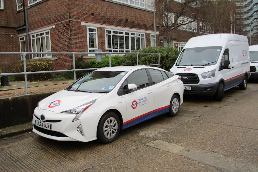 Details: It is now mid-April but the highest reported fleetnumbers to date are still those on a pair of Toyota Prius cars delivered at the end of January (8629T and 8630T). Both were seen in Acton Works on 10th April 2018 and shown here is 8629T, parked in front of Ford Transit van 8411F. |