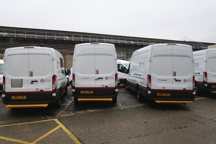 Details: Most of the vehicles in the van yard at Acton Works are parked such that only their backs can be properly photographed. This line-up, seen on 10th April 2018, comprises three Ford Transit Mk8 vans. Crew van 8287F on the left and van 8408F in the centre are 'rare', neither having yet been reported out on the road. Jumbo van 7948F on the right was one of the first Mk8s taken into stock and has at least racked up a few sightings, always at night of course. |