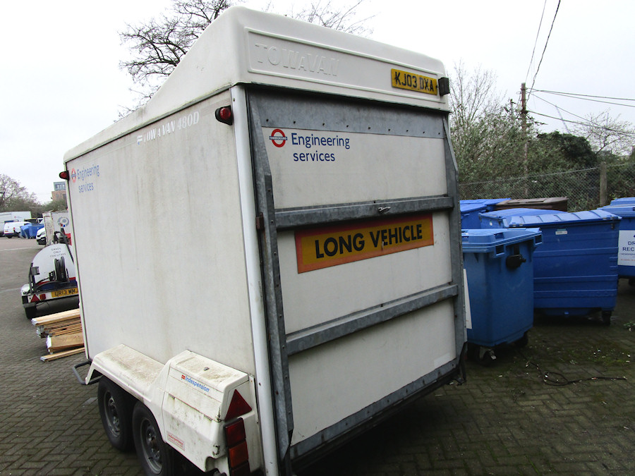 Details: One of the Cobul box trailers previously based at Lillie Bridge was moved to Acton Works a year or more ago. We finally got a chance to take a close-up look at it on 10th April 2018 and, unfortunately, it carried no identification marks. It is labelled as a 480D model, which confirms it is either CBT57 or CBT58. These were used by the ventilation department in conjunction with their mobile generators, and they appear to have been replaced by a pair of Peugeot Boxer vans in late 2014. The registration plate on the rear of this trailer shows KJ03DXA, this belonging to Ford Transit 5474F which started life as a dropside truck but was converted to a generator in about 2011. It was last licensed in February 2016. Two other items of interest are just visible in this photo taken in the lorry yard. First is mini tanker trailer T70, which was carrying the registration number of Ford Transit 7653F, sold in November 2017. Curiously, T70 has been seen in use since then (for example with 8430VW in December 2017) so it is odd that it regained the plates of a withdrawn vehicle. It may have been withdrawn more recently though, as a possible replacement was seen elsewhere in the works. Lastly is a demountable box body, now resting on the ground and in use as an electrical waste store. This carries a Tube Lines logo but its identity is also not currently known. |