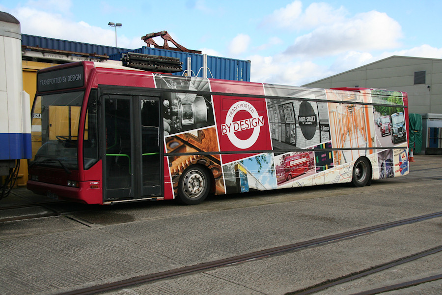 Details: Optare Excel exhibition bus R197DDX has been shown on LTSV twice before but this photo has been included to show two recent changes. Firstly, the livery has been changed from 2014's 'Year of the Bus' to 'Transported by Design'. Secondly the fleetnumber LTM004 has been applied near the front door. Numbers LTM001/2/3/8 have also been recorded, while LTM005/6/7 are presumably carried by some of the other exhibition units. Seen in the rear yard of the Museum Depot at Acton on 5th November 2017. |