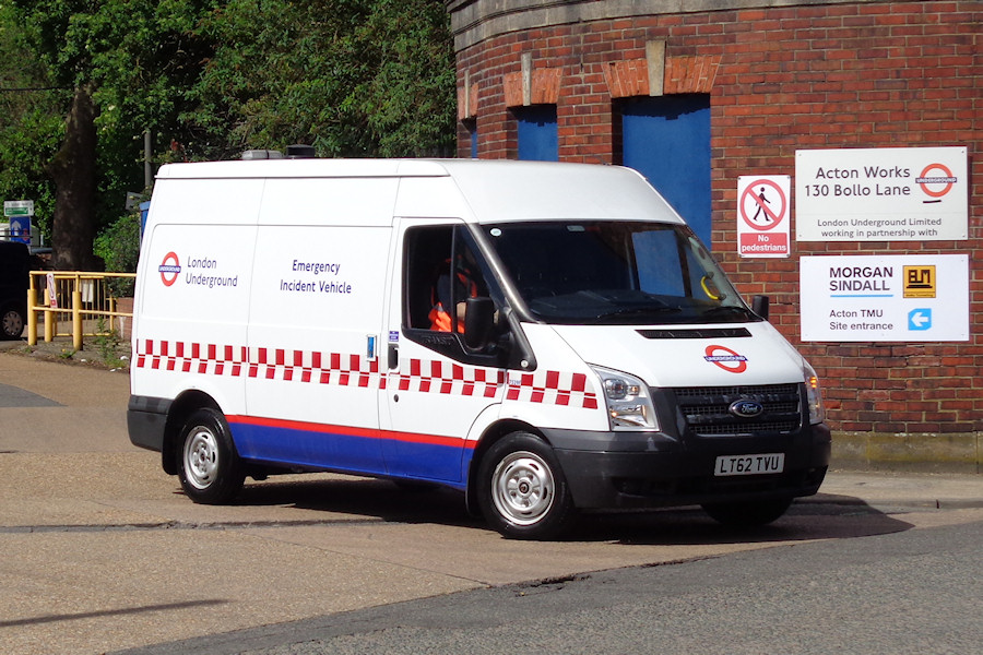 Details: Ford Transit van 7529F has 'emergency' livery for its role as an Escalator Services Emergency Incident Vehicle. It can usually be seen resting in its own private shed at the south end of Frank Pick House in Acton (just by the north end of the lorry yard), but Ray managed to catch it on the move on 10th May 2018, leaving Acton Works. This van carried Tube Lines livery when new. The Morgan Sindall sign on the wall behind is new. |