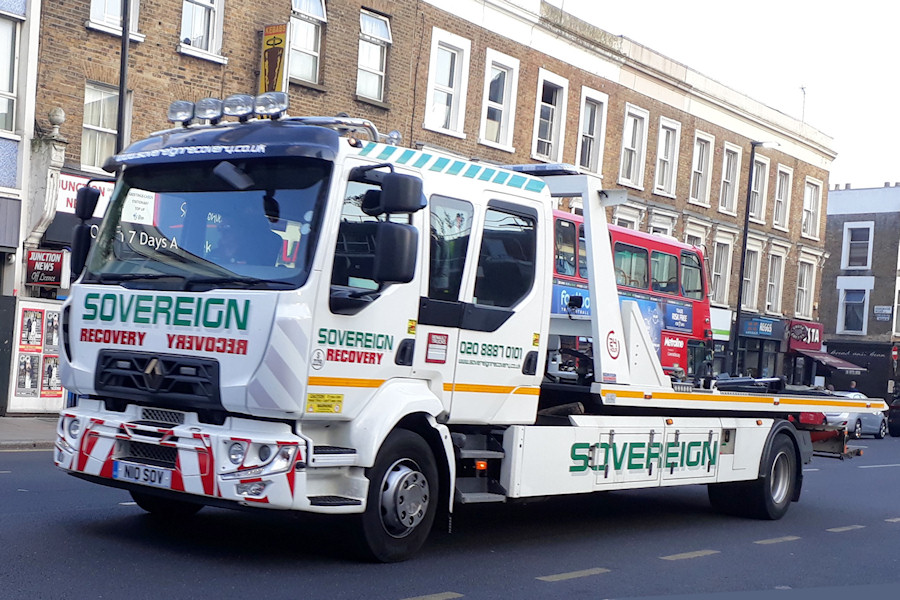 Details: Sovereign Recovery N10SOV is a Renault D12 flatbed recovery vehicle, seen passing through Archway on 27th May 2018. Trucks like this are used for recovering cars and light commercial vehicles, rather than buses, so they are not considered to be service vehicles as such, and are not included in the database. Note the fleetnumber (S229?). The 200-series appears to be used for flatbeds like this one. H1xx are for heavy recovery vehicles and V3xx for engineering support vans (both of which types are covered in the database). One other point to note is that the registration number N10SOV has been used on at least three other Sovereign vehicles. First seen on a 2-axle DAF in 2009, it switched to a VW Transporter van by 2011 and then to a 3-axle DAF by 2016. |