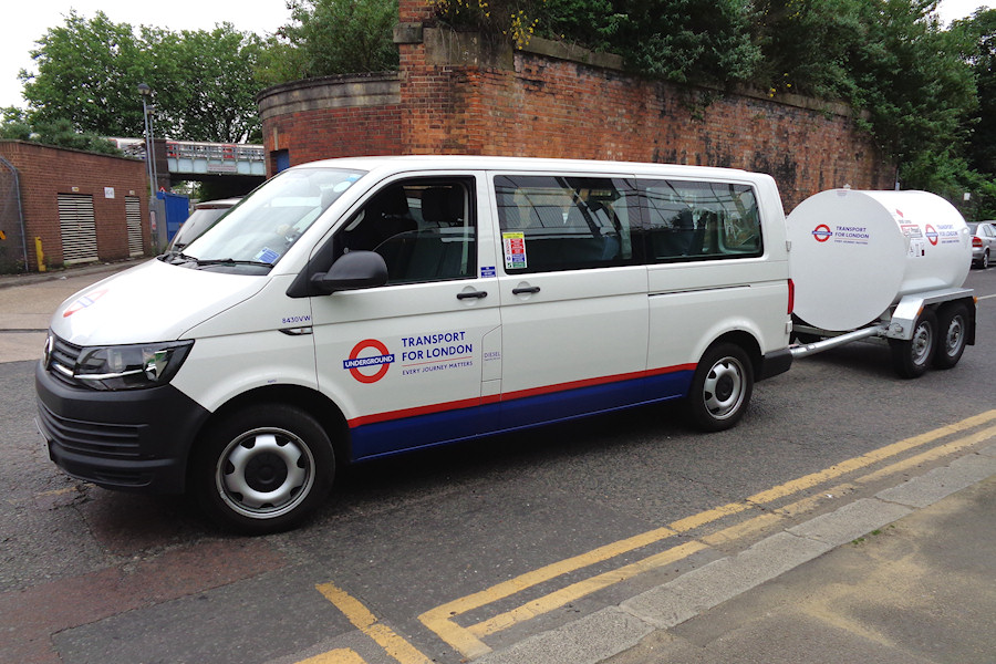 Details: It would appear that Volkswagen Transporter 8430VW is now the designated fuel delivery vehicle for LUL. Rather an odd role for a minibus, but it is used in conjunction with a mini-tanker trailer, and it is believed that its function is to re-fuel track maintenance machines. Latterly used with trailer T70, a new (and larger) trailer by Fuel-Proof was delivered in early 2018, and was seen behind 8430VW arriving back at Acton Works on 7th June 2018. |