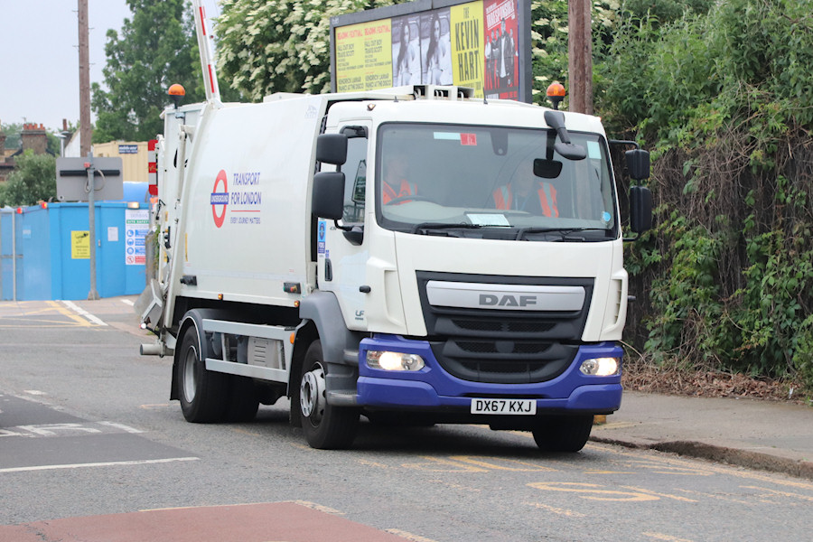 Details: DX67KXJ, the second new DAF dustcart, seems to be the shyer of the pair. Derek found it approaching Acton Works on 5th June 2018. The livery is the same as that on sister DX67KXH. |