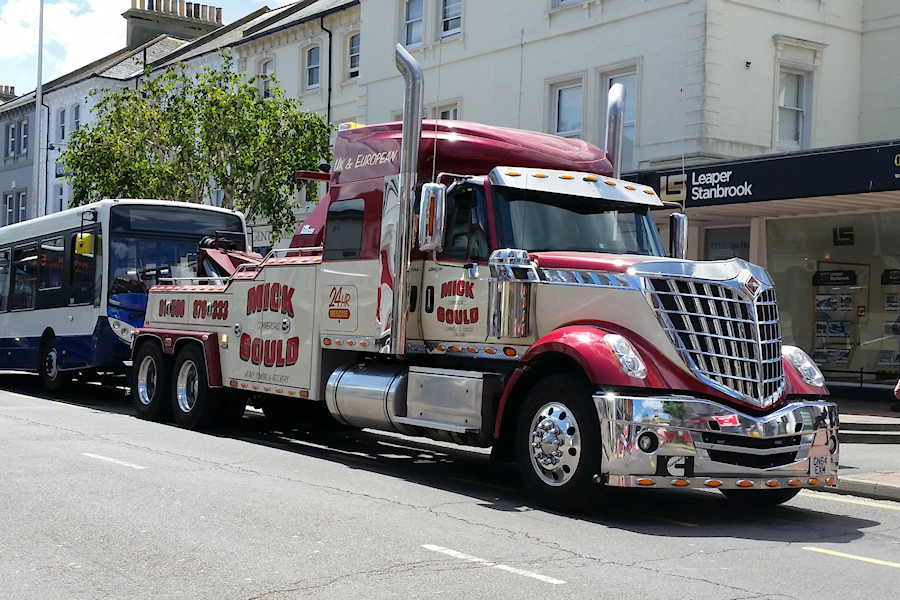 Details: Mick Gould Commercials of Flimwell in Sussex is well-known for its rather exotic recovery vehicles, two of which have featured on LTSV before (in 2006 and 2010). A more recent addition is this International Lonestar, built to order in the USA in 2014. The design is even more ostentatious than the other two examples, and the sheer number of orange blimp lights is amazing, as is the amount of chrome, the size of the exhaust 'chimneys' and the huge wheelbase. As per the previous two, this monster was engaged in bus recovery work in Eastbourne when snapped on 21st June 2018. |