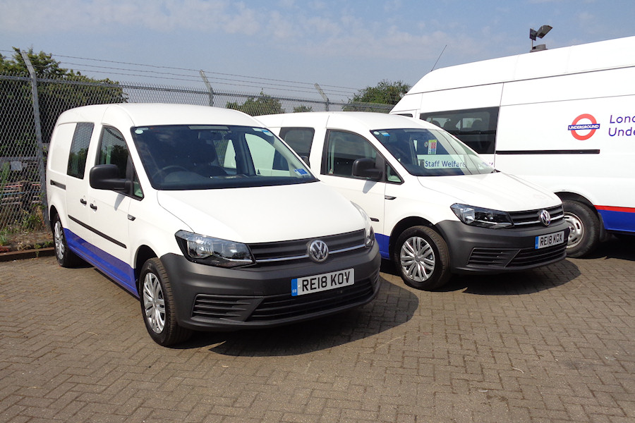Details: When Ray visited Acton Works on 26th July 2018 it was learned that a batch of eleven Volkswagen vehicles in the process of delivery was destined for use by the Elizabeth Line. Parked in the lorry yard were Caddy Maxi crew vans RE18KOV and RE18KOX (with one of the remaining facilities vans beyond). Similar RE18KOU had already been moved to the new vehicle preparation shed to have its lettering (and purple stripe) added. |