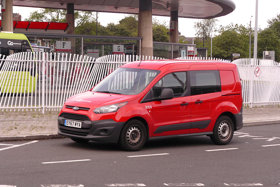 Details: Two things have their roots in Sunderland; the Go-Ahead group and my family. Because of the latter, I recently took my daughter for a visit to some of the places I spent my childhood holidays. Go North East uses extensive branding for most bus routes, with vehicles appearing in a multitude of colours. The branding is sometimes based on the places served, sometimes a pun on the service number (such as the 50 which becomes the 'Why-Aye Five-O' with beach themed graphics!). One link to the sensibilities of the London operation was this plain red van found parked at Sunderland (Park Lane) Interchange on 4th August 2018. A Ford Transit Connect Mk2 crew van, it is very similar to those used in London, even down to the EY67Wxx registration. Differences are that the company logo is carried, and it has a fleetnumber (1059). Several more examples in the same range were later seen at Washington. |