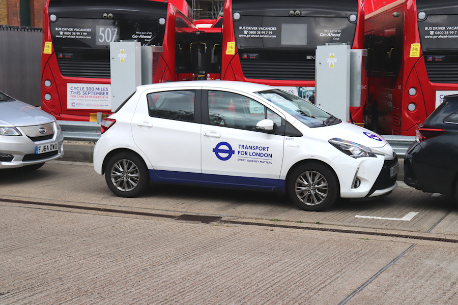 Details: There are now six variations to the basic white/blue livery (or seven if you differentiate LBSL white/blue/red from LUL white/blue/red), and all but one are covered in the next five photographs. By chance, the set starts with the most basic livery, the 'no-stripe' white/blue as used by TfL Streets. Except that, as can be seen here, there is a stripe between the two base colours. As far as is known, the stripe is actually a safety feature, being highly reflective to aid visibility. So, on this livery, the stripe is white. I'm not going to start calling it white/blue/white though! Anyway, onto the photograph... A somewhat unusual visitor to Go-Ahead London's Waterloo Garage on 21st August 2018 was TfL Streets Toyota Yaris car 8597T. This garage runs the erstwhile Red Arrow bus routes, now operated with battery electric buses, several of which can be seen plugged in and charging in the background. It is also home to one electric car, built by the same company as the chassis of the buses (BYD of China). FJ64OWO is just visible on the left. Given that the TfL Streets base is less than half a mile from here, the reason for 8597T's presence is not known. Perhaps its driver was making use of the canteen at this location, which is now open to the public as well as to bus drivers. |