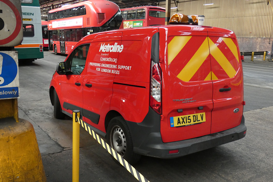 Details: Another open day was held at Holloway Bus Garage on 15th September 2018, Metroline being the only company to now do these events on a regular basis. The garage was still working normal services and was divided in two for safety reasons. Parked just on the operational side was resident engineers van AX15DLV, a Ford Transit Connect Mk2 new in 2015. As can be seen, this van features a small light-bar (and coffee cup!) and strangely it was only reported once prior to the open day. Parked in front is one of the Volvo double-deck buses with which Grey Green started running central London route 24 in 1988. These buses had underfloor engines and therefore had several steps at both the entrance and exit doors, in marked contrast to today's universally low-floor bus fleet. |