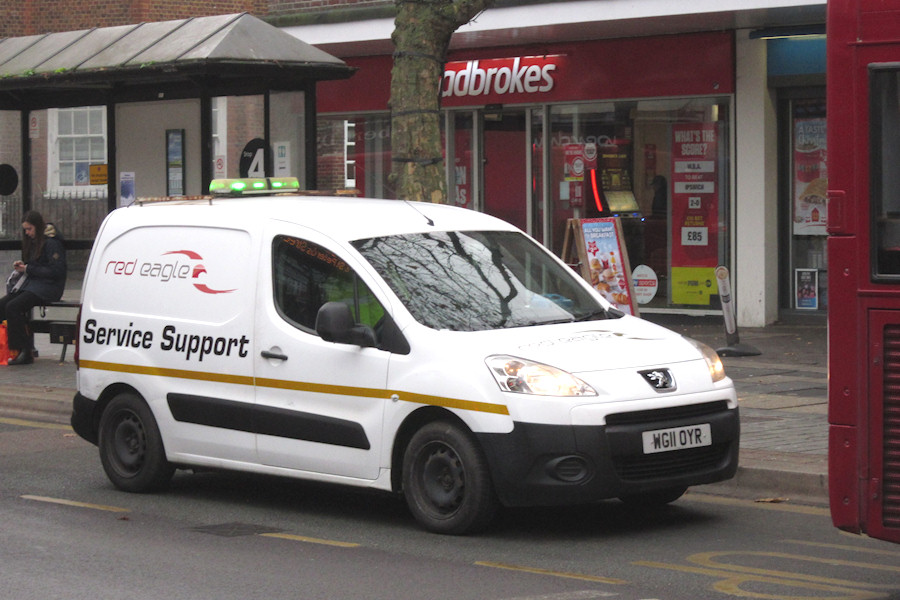 Details: Staying in the Home Counties, this view was taken in St Peter's Street in St Albans on 23rd November 2018 and shows a Peugeot Partner van belonging to Red Eagle Buses attending to one of their Dennis Darts. Bus operations outside of London are a bit of a mystery to me and I had to look Red Eagle up. According to LOTS they are one of the three 'Aylesbury Reds', having connections with Redline Buses and Red Rose Travel. It has about 20 buses and operates in Hertfordshire and Buckinghamshire. Note that the light bar on this van appears to be green rather than the more normal yellow/orange! |