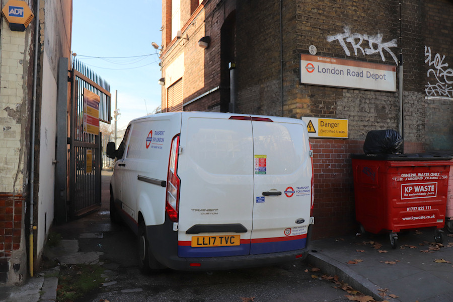 Details: The back end of Ford Transit Custom van 8508F makes its second appearance on LTSV. Derek did in fact photograph it from the front as well, but I chose this photo as it shows the narrow entrance to London Road Depot (Elephant and Castle). There is a small yard here which often contains up to about ten service vehicles. However, from the gate you will only see any that happen to be parked at the nearest end (Ford Transit dropside 7821F can just be glimpsed here). You can see everything from the other end of the depot, particularly from the upper deck of a bus passing the Imperial War Museum, but they are then much too far away to be identified. 4th December 2018. |
