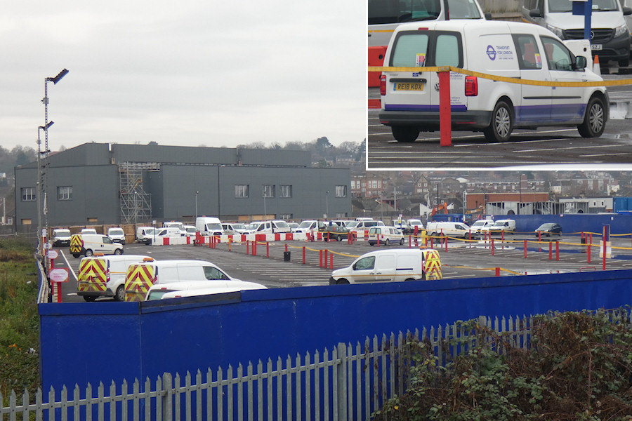 Details: A puzzle developing in autumn 2018 was where the Elizabeth Line vehicles had gone. Some of the Ford vans are still at Acton Works, but the initial batch of mainly Volkswagens had pretty much disappeared following delivery in August. Romford was mentioned by staff, and there is a very large Network Rail facility there. The Elizabeth Line has its main depot at Old Oak Common (where you can currently see a very impressive line-up of class 345 trains awaiting entry to service), and a smaller depot is currently being developed at Plumstead, the site having been used as a base for construction trains for the past few years. While cycling to Plumstead along the Ridgeway on Christmas day, I spotted one white/blue/purple van in a recently opened (but temporary) yard otherwise occupied by contractor's vans mainly in unmarked white (with yellow safety stripes). I returned with my camera the following day (26th December 2018) and identified the van as 8641VW. I also noticed that at least one of the vans close to the fence nearest the camera was also an Elizabeth Line vehicle, but I could not get an ID on it. |