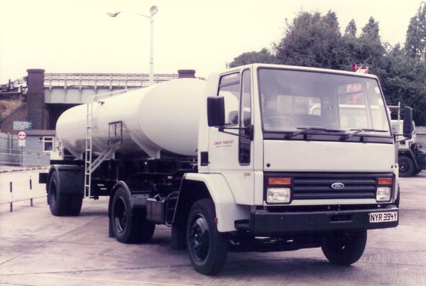 Details: Ford Cargo 1913 articulated unit 2394F (NYR394Y) was one of several service vehicles on display during the open day at Chiswick Works on 5th August 1984. It was coupled to a rather antique looking tanker trailer. |