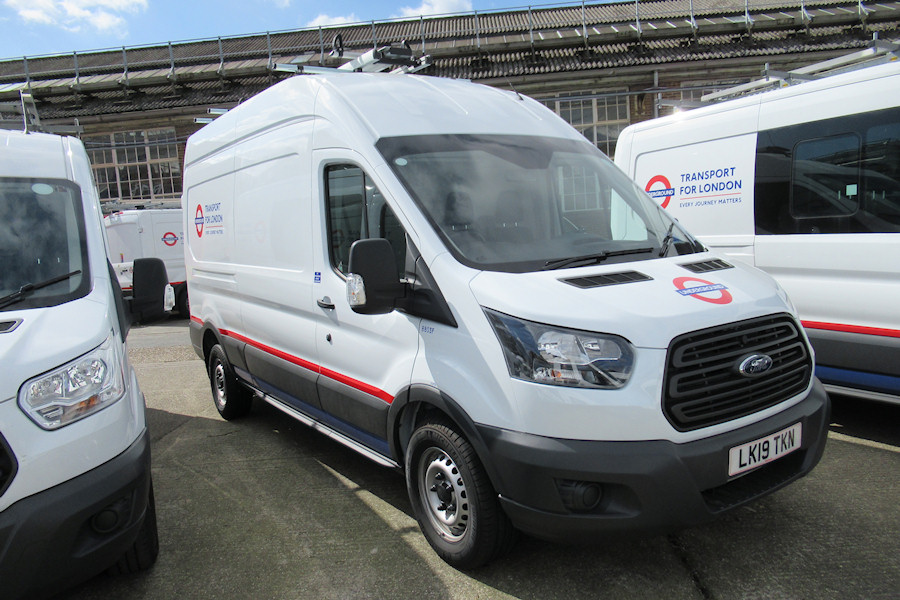Details: With new deliveries still mainly numbered in the early 87xx series, it was surprising to find a few 88xx-numbered vehicles arriving in March 2019. Among them was high-roof Ford Transit Mk.8 van 8803F, seen in the van yard at Acton Works on 26th March. |