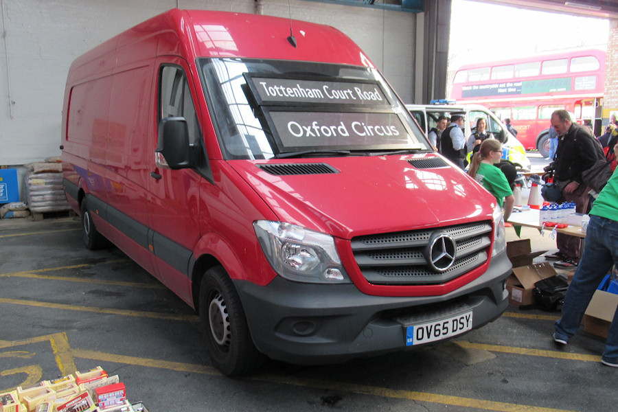 Details: An open-day was held at Stagecoach London's Barking Garage on 30th March 2019, to mark the 40th anniversary of the last London Transport RTs in passenger service. The event was very well attended, although it has to be said that a large proportion of the visitors looked like they might have been there in 1979 as well! Two service vehicles were present, this one being the one that was easy to miss. Anonymous red OV65DSY is based at West Ham garage and used for unknown general purposes (ie not engineering support). A Merecedes-Benz Sprinter, it is to the longest of four lengths, a whopping 7.3 metres. A slip-up in LTSV database consistency means I have recorded this van as being mid-height. It is technically mid-height, but Mercedes call this 'high-roof', and this was used on LTSV for the description of the LBSL IRUs. Which are the same height. As this van. So, um. Anyway, the van was parked inside the garage, next to a stall selling bus-related items such as moquette cushions! |