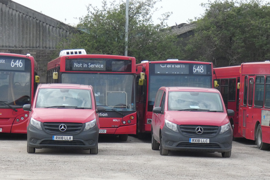 Details: As well as a display of buses at Barking Garage, and various local routes operating with RT-class buses, the RT 40th anniversary event on 30th March 2019 featured a small array of preserved buses at Go-Ahead's River Road Garage. This was not in the garage itself but in a large yard to the south east of the main yard. Access was from Creek Road instead of River Road, although I forgot to check whether there was a connection between the two yards. The elusive engineering van was hiding in the main garage, meaning only the crew ferry minibuses could be photographed. Seen in the 'new' yard were two of the RX18LLx batch. RX18LLA was new here but was operating from Orpington earlier in the month. In the background is an interesting array of single-decker buses, including the unique MDL1, an MCV-bodied VDL SB180. |