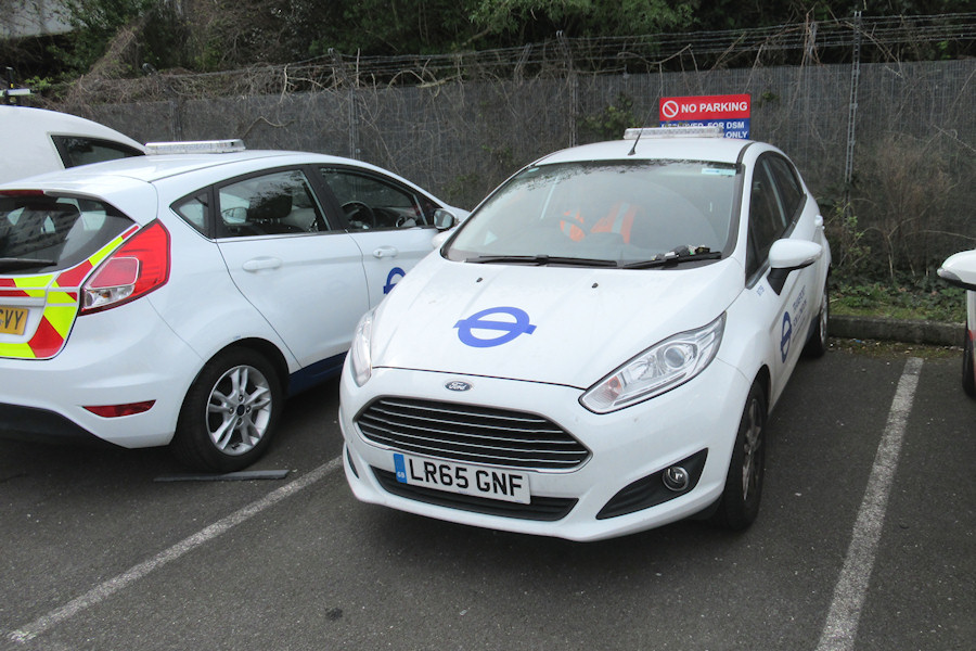 Details: Not previously illustrated, 8174F and 8175F were a pair of petrol Ford Fiesta cars delivered at the end of November 2015. They were given TfL white/blue livery and were allocated to Chancel Street in Southwark, the base of many TfL Streets vehicles. Rather typically for vehicles from this allocation, they were never seen 'at work' and the exact nature of their role is unknown. We do know that they both notched up over 13,000 miles though. By the end of March 2019 they were back at Acton, presumably not being suitable for use within the ULEZ. On 5th April they were photographed in the staff car park, this view neatly showing both the front and rear (the latter with chevrons) and also the small light-bars fitted. The pair left for BCA Blackbushe a week or so later. |