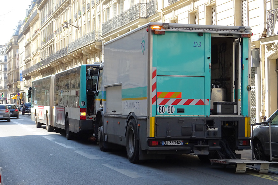 Details: Although RATP runs about 1,000 buses in London, its origin and main business is in the provision of public transport in the French capital of Paris (RATP stands for Regie Autonome des Transports Parisiens). We can now show a 'home' RATP service vehicle in the form of Renault Premium truck BJ-350-NS, photographed in Paris on 31st March 2019. This box-bodied lorry is used as a breakdown tender (depannage translates as 'troubleshooting', 'help' or 'fixing') and it was seen attending to MAN Lion's City articulated bus 4680. Note the 1/3rd width tail-lift and the various doors and compartments. The RATP logo (which is either a stylised map of the River Seine in Paris or an upturned face depending on how you look at it) is carried towards the rear of the side. |