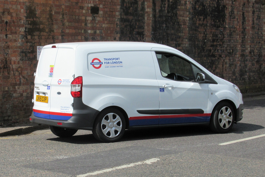 Details: The then-new Ford Transit Courier model was briefly popular in 2015, with 21 being added to the central fleet, followed by just two more in more recent years. Of the initial 21, ten were for the Lifts and Escalators section based at Frank Pick House at Acton, although many of the vans were outbased elsewhere. This department renewed almost its entire fleet in spring 2015, and again in spring 2019. The nine remaining Transit Courier vans were returned off lease during May, including 7971F seen leaving Acton Works on the 2nd. It is not yet clear what has replaced them, recent small vans being either Renault Kangoo or Volkswagen Caddy types. |