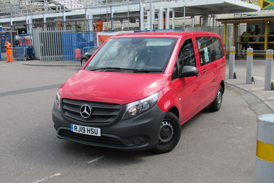 Details: Go-Ahead London took a new batch of Merecedes Vito minibuses in April 2019, finished in the usual anonymous red livery. We were advised there were to be eleven in total and, so far, we have tracked down nine. They are spread around five of the group's garages, RJ19HSU being one of a pair at Northumberland Park. It was seen at Tottenham Hale station on 8th May 2019, with crew ferry number 5 in the window (similar RJ19HSV was 1). |