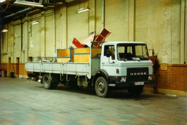 Details: 2385D (NYR385Y) was a rather long-bodied but basic dropside lorry, based on a Dodge G12 chassis. Used for all manner of jobs, it was found in Wood Green bus garage on 13th May 1986. The lorry was later repainted in the then new blue and white livery. The arrangement of doors and hanging bangers will be familiar to anyone with a knowledge of British Railways wagons! |