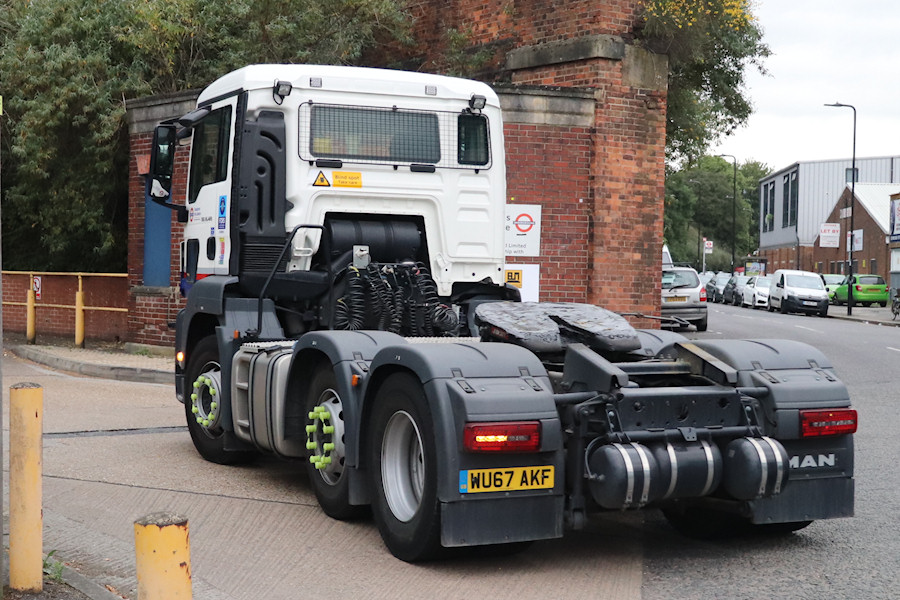 Details: The newest artic lorries in the central fleet are two MAN TGS 3-axle units new in 2017. If you stand on Bollo Lane in Acton for a while, one or other of the pair will come past, although it is unusual to see one without a trailer attached. WU67AKF was caught arriving at Acton Works without a trailer on 4th June 2019, affording us a clear view of the coupling. |