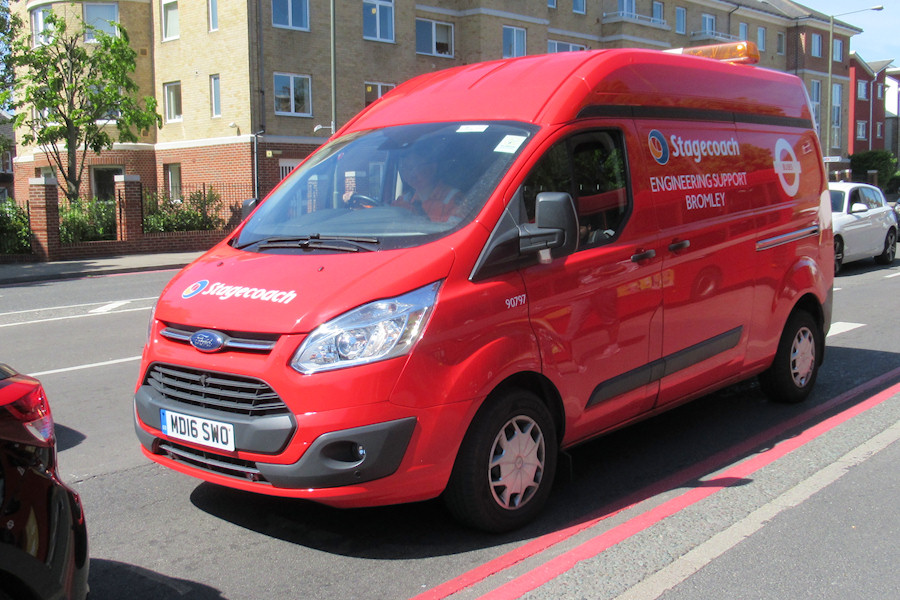 Details: This is not the van I am looking for! Stagecoach London's Catford garage got a new engineer's van at the end of 2018, replacing relatively young MC16FGV. However, the new van (MX68ZMU) has not yet been photographed. What Ray did find on 14th May 2019 was MD16SWO from Bromley garage, seen passing Bromley North station. This van has not been illustrated since gaining lettering and fleetnumber 90797. Each Stagecoach London garage has one of these vans, but the fleetnumbers are all over the place, ranging from 90796 to 95261. I believe that Stagecoach's national fleetnumbering scheme means that new vehicles are allocated vacant numbers almost at random. |