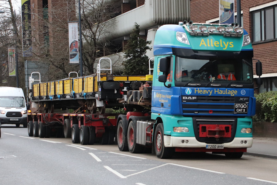 Details: I recently promised you some more 'trains on trucks', and here they come. As has been seen, many of LUL's Turbot ballast wagons have been visiting Eastleigh Works, some for overhaul, others for scrapping. It seems that various other types have also been making the trip to Hampshire. Seen passing through the town on 19th March 2019 was Allelys DAF XF T200AHH (fleetnumber 37), last seen on LTSV in 2015. The trailer looks to be the same one seen behind T800AHH at Acton this April. On the trailer is wagon GP906, one of 41 general purpose (hence the GP prefix) bogie opens built by Procor in 1985. Note the blue cargo straps, suggesting that the wagon was loaded. Closer inspection of the photo shows that it appears to be carrying several yellow panels, most probably the dropside doors latterly fitted to the Turbots. |