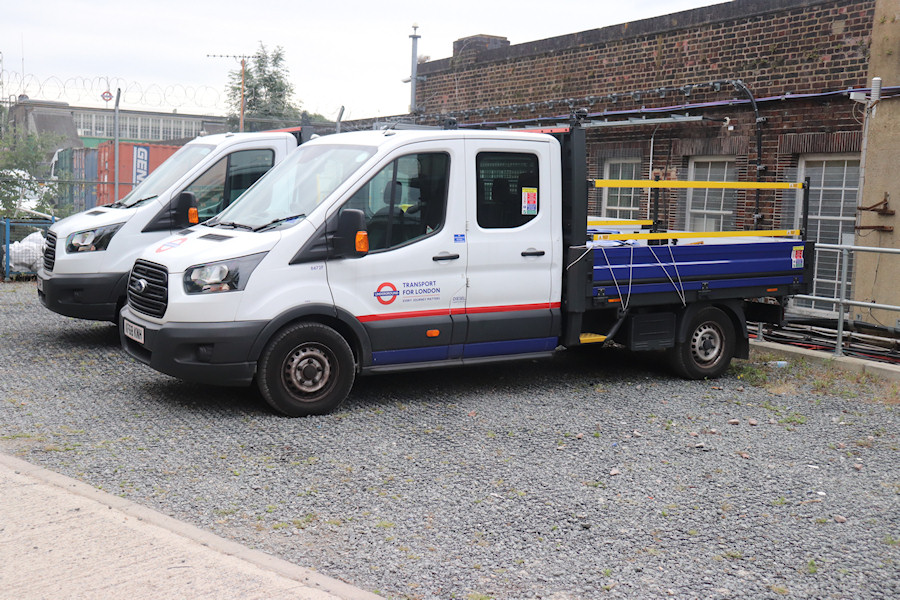 Details: Dagenham East Station is one of many locations where the vehicles are quite easy to see but very hard to identify. They park in a yard alongside the eastbound platform, but there is a wall and/or buildings along almost the whole length. Access to the yard is via a roadway that comes out next to the station building (visible in the left background). So, you can see the vehicles from either end, but at some distance. Derek got permission to walk down to the yard on 9th July 2019 and found three vehicles present. Ford Transit Courier crew van 8105F was out of shot to the left, while dropside 8472F was parked close to the platform. Next to 8472F was CP19SOH, another Transit dropside but without a crew-cab and in unmarked white. This is presumably a hired vehicle, perhaps pending the delivery of more Transits. |