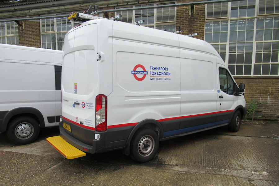 Details: About a third of the Mk8 Ford Transit vans supplied to the central fleet so far have been high-roof, the remainder being mid-height. 8674F is a long-wheelbase, high-roof van with a ladder rack on the roof and a large rear step. It was photographed at Acton Works on 25th June 2019. |