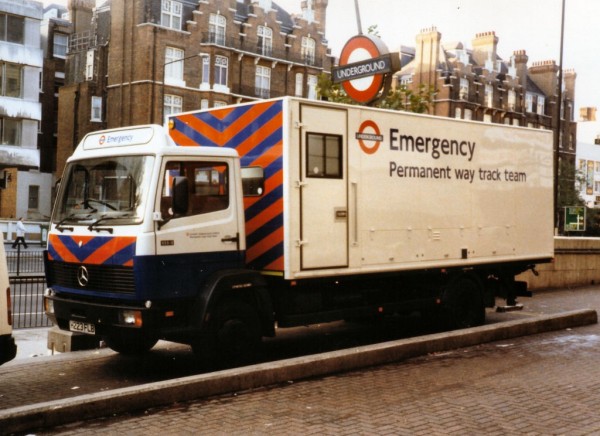 Details: Mercedes-Benz 814 demountable 2491M (H223FLB) was found parked outside Baker Street station in 1990. The flexibility of demountable vehicles is demonstrated by further pictures of this vehicle carrying curtain sided and drop sided bodies. Although it would certainly make an attractive feature, the large roundel above the box body does not belong to this vehicle! |