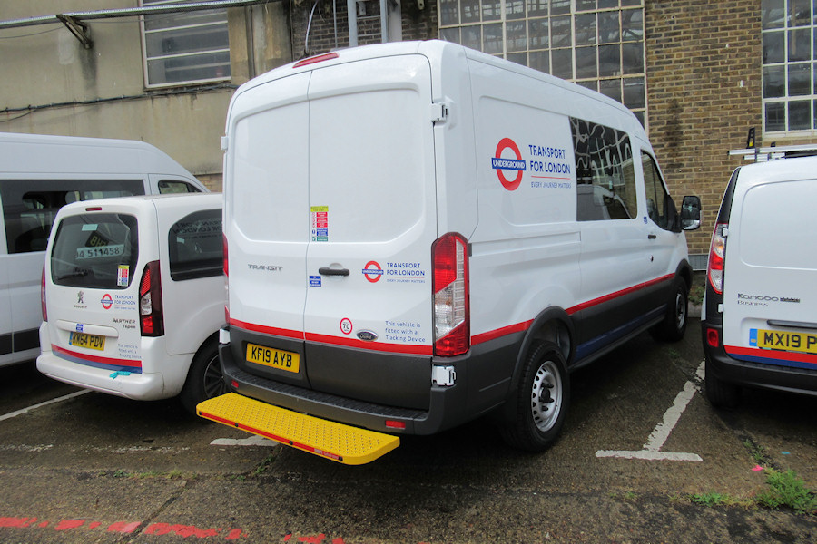 Details: New and old in the van yard at Acton Works on 20th July 2019. Taking centre stage is recently delivered Ford Transit crew van 8843F, while one of the ten or so Renault Kangoo Maxi vans with MX19xxx registrations is on the right. The car to the left is Peugeot Partner Tepee 7905P, only occasionally reported, usually when visiting Wood Lane control centre at night. |
