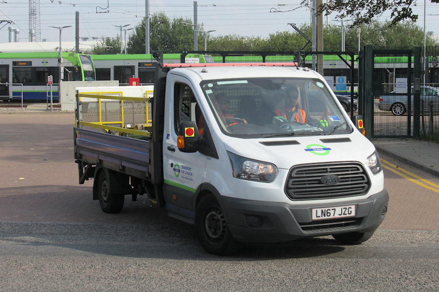 Details: Tramlink operates a trio of dropside trucks in addition to almost a dozen small vans. Ford Transit Mk8 8566F was delivered in October 2017 to replace Mk7 Transit 7590F, but we had to wait almost two years before anyone managed to photograph it. On 24th August 2019 it was seen leaving the Therapia Lane depot. The similarity of the white/blue/green livery to that worn by the trams themselves can be seen. The Tramlink name may now be defunct, officially at least. While the name was carried on the roundels of the original fleet of service vehicles, additions since 2016 show just 'TRAMS'. |