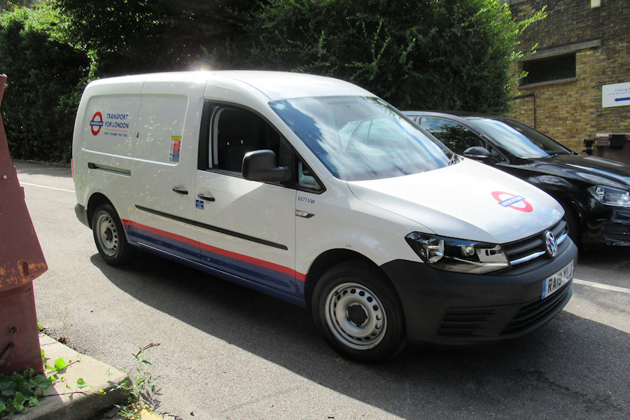 Details: Along with numerous Volkswagen Caddy Maxi crew vans, a batch of five plain vans was delivered in August 2019, having spent a couple of months sitting at the dealership in Bedfont. 8871VW, photographed on the stub road at Acton Works on 15th August 2019, had only been licensed two days earlier yet had already been treated to full LUL livery. At the time, the other four were in the front car park, still in unlettered white/blue. |