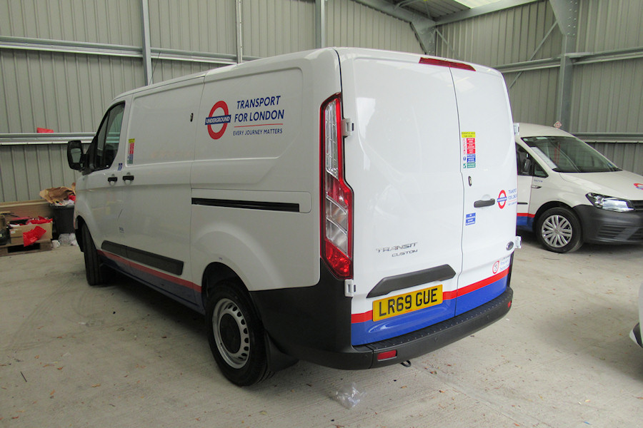 Details: The vehicle preparation shed in the lorry yard at Acton Works is now used for the work involved in making newly-delivered vehicles ready for service. This includes the application of livery, lettering and labels (although this is also still sometimes done elsewhere in the works), along with the fitting of any special equipment (perhaps including the trackers mentioned on the back of most vehicles). Present on 12th September 2019 was a short-wheelbase, low-roof Ford Transit Custom van numbered 8876F. Sisters 8877F and 8878F were nearby, and I suspect this trio will be to replace similar (but suffix-less) 8075-8077. If so, they are unlikely to be seen in daylight again! In the background is VW Caddy Maxi crew van RK69TZZ which had just been given LUL livery and the fleetnumber 9007VW. |
