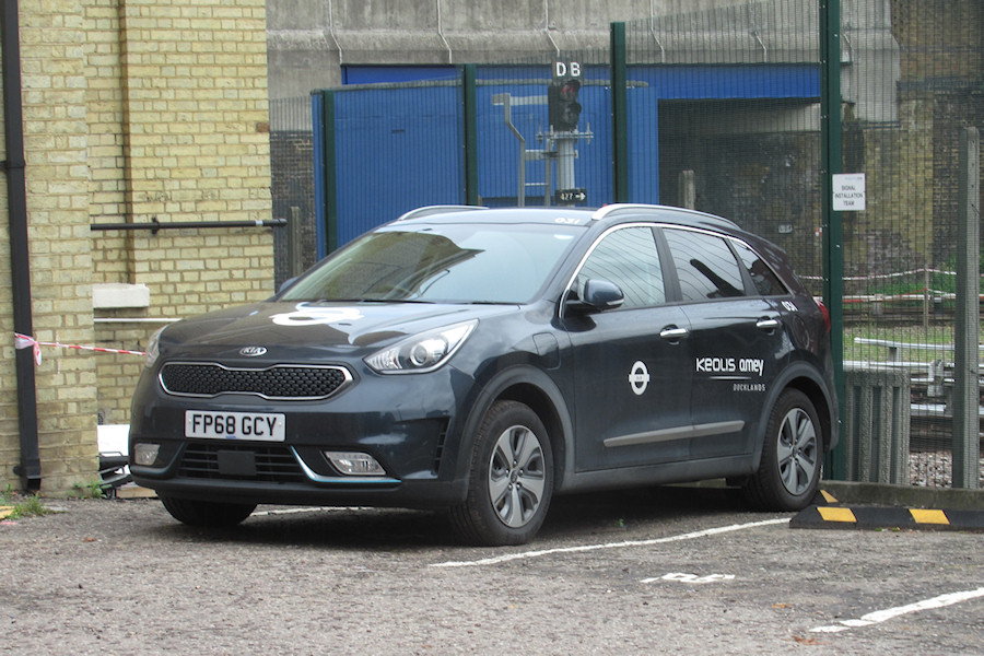 Details: As well as a sizeable fleet of vans in white/green/yellow, the Docklands Light Railway service vehicle fleet includes at least two of these Kia Niro hybrid-electric cars in black with white lettering. Fleetnumber 031 is carried by FP68GCY, seen at the far north-east end of the Poplar Depot (off Harrow Lane) on 28th September 2019. The parking marker on the fence behind shows that this space is reserved for the Signal Installation Team, although the DLR does not use conventional railway signals. Having said, a fairly normal signal is visible in the background, these presumably being needed within the depot confines, where trains would be driven manually. |