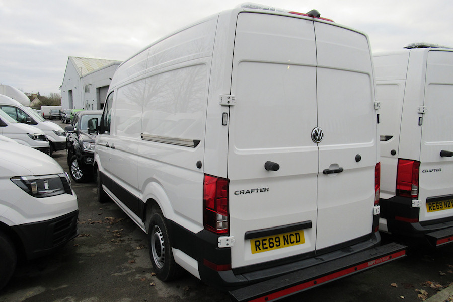 Details: Although it may turn out that the Volkswagen Crafter vans accumulating at the Bedfont dealership are not in fact for use as service vehicles, I am including one more photo of them, again taken on 7th December 2019. RE69NCD shows the hazard lights (on each side just below the upper door hinges), the LED light-bar, and the 'Safe-T-bar' rear bumper. The protrusion at the top centre of the rear is believed to house a camera for use when reversing/parking. Three or four similar vans can also be seen here, including RE69NBY on the right. |