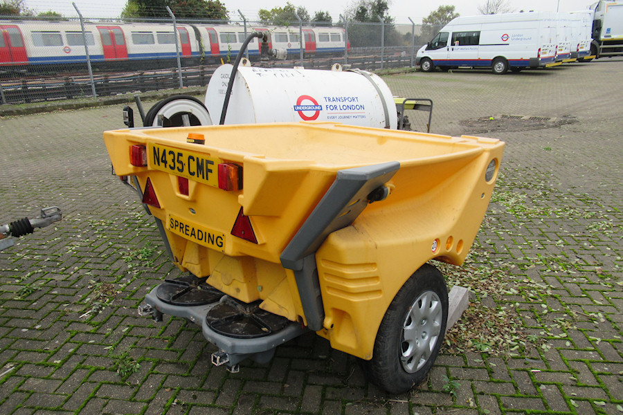 Details: The trailers are getting smaller, indeed it would be hard to make one smaller than this. Seen in the lorry yard at Acton Works on 21st November 2019, this is a Turbocast 1000 (!), towable salt/grit spreader made by Glasdon. The main part of the trailer is a 500kg capacity hopper made of plastic (Durapol), while a pair of chain-driven, spreading wheels are at the bottom. One notable aspect of this trailer is that it was carrying the registration plate N435CMF. This belonged to the ex-Police Land Rover, which is believed to have been disposed of in 2016. So, presumably the trailer has been in use for a few years, but has not been out on the public highway. Also visible in this photo is the smallest numbered trailer, mini-tanker T70. This was replaced by a new trailer in early 2018, but it has evidently been retained. Visible on the left is the tow-bar of box trailer CBT57. This part of the lorry yard was normally full of facilities vans until the fleet was cut back at the start of 2018. The three remaining facilities vans can be seen in the top right, these being 7675F, 7674F and 6517F. 6517F is now eleven years old, and is one of very few service vehicles to still have Tube Lines branding. |