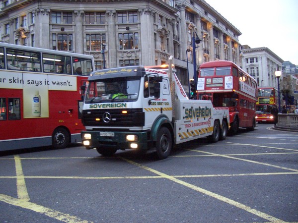 Details: Sovereign is a London bus company but this vehicle is nothing to do with them. This Sovereign has a contract for bus engineering support in central London and they use a variety of vans and tow trucks. Caught on film towing an Arriva RML across Oxford Circus on 10th April 2004, P700TOW is a large Mercedes-Benz SK bus recovery truck. |