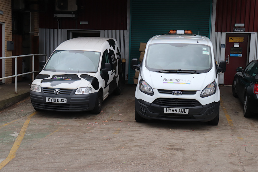 Details: I haven't shown any service vehicles from outside London for a while. So, here is a view taken at Reading's bus garage on 30th June 2019. Two vans were present, the VW Caddy on the left wearing a curious white and black livery. This may be explained by the signwriting on the side, which reads (with my capitals!) 'Reading Buses. Keeping our buses on the mooove'! Reading Buses is known for using lots of different colour schemes on its buses, groups of routes being linked to the colour of the buses used on them. The strips of coloured blocks below the fleetnames on these two vans appear to contain most of the colours used. |