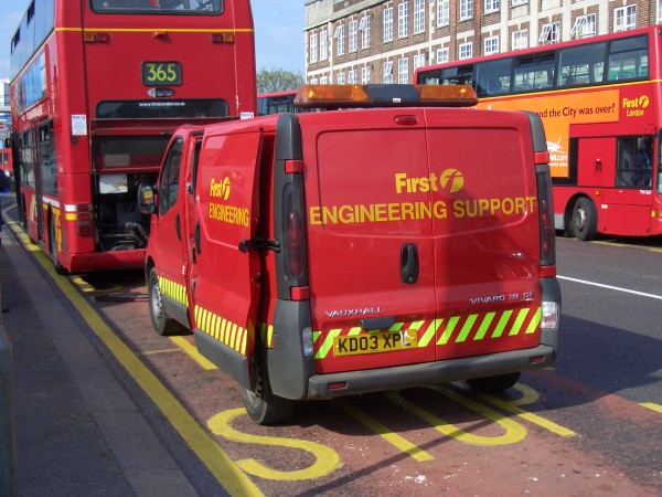 Details: The strangeness of the Vauxhall Vivaro van is carried through to the rear, with curious looking lights and mouldings. First 71 (KD03XPL) was attending to a TNL bus that had had a wallop when photographed near Romford Station on 17th April 2004. |