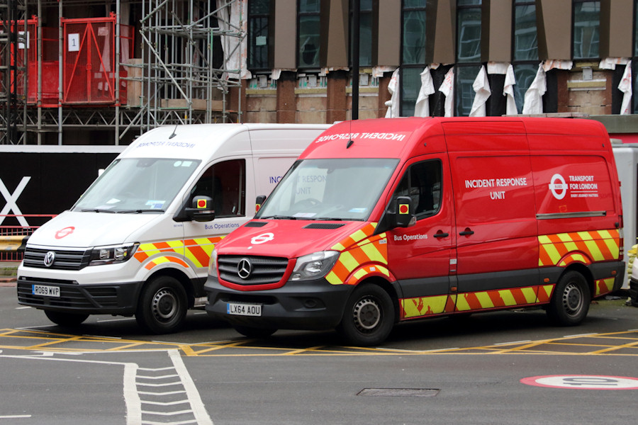 Details: The London Buses Incident Response Unit fleet is in the process of being changed over from red Mercedes Sprinters to white Volkswagen Crafters. During this period, some locations have both types based, thus allowing comparison shots such as this one taken at Aldgate Bus Station on 10th March 2020. New 9074VW on the left had arrived about a week earlier, while 7842M has been based here since 2017, having been moved around a bit during its first two years. As can be seen, the two types are very similar in size, while the layouts of the livery and lettering are broadly the same. |