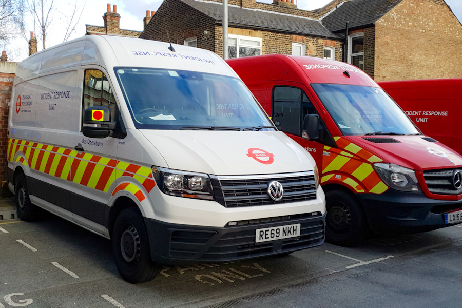 Details: Another old-new IRU comparison shot, this time taken at Turnpike Lane Bus Station on 20th March 2020. This location has an allocation of around 5 IRUs, though 9058VW (on the left) is the only new example reported so far. It was parked alongside Mercedes 7843M, based here since new in May 2015. I should apologise for the cropping of this image. Peter's original image was nicely composed but it was to a rather wide format. For various reasons, I am trying very hard to keep all images on this website to a standard aspect ratio of 3:2. I could have added a blank strip at the top or bottom but it seemed best to just chop off a bit of the Mercedes. |
